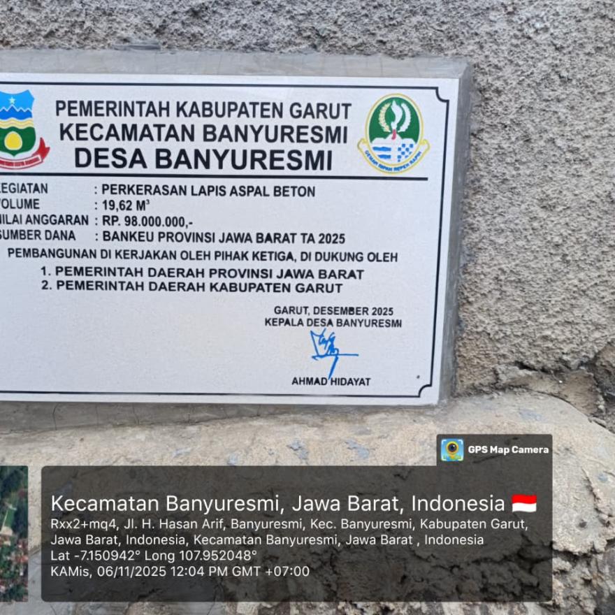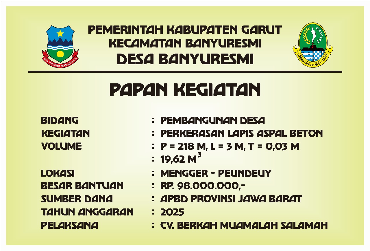 Pemerintah Desa Banyuresmi telah melaksanakan pembangunan infrastruktur jalan penghubung antara Kampung Mengger – Kampung Peundeuy berupa Perkerasan Laspis Aspal Benton yang bersumber dari Bantuan Keuangan Provinsi Jawa Barat Tahun Anggaran 2025.